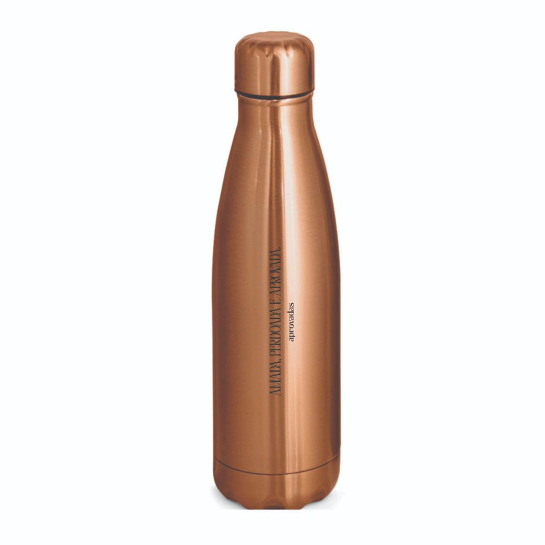 Esta garrafa de aço é resistente e prática, disponível nas cores dourada ou bronze. Com o design elegante que traz a assinatura "aprovadas", ela é ideal para manter suas bebidas na temperatura certa durante o dia todo. Compacta e durável, acompanha seu ritmo com estilo e segurança, promovendo hidratação saudável onde você estiver.